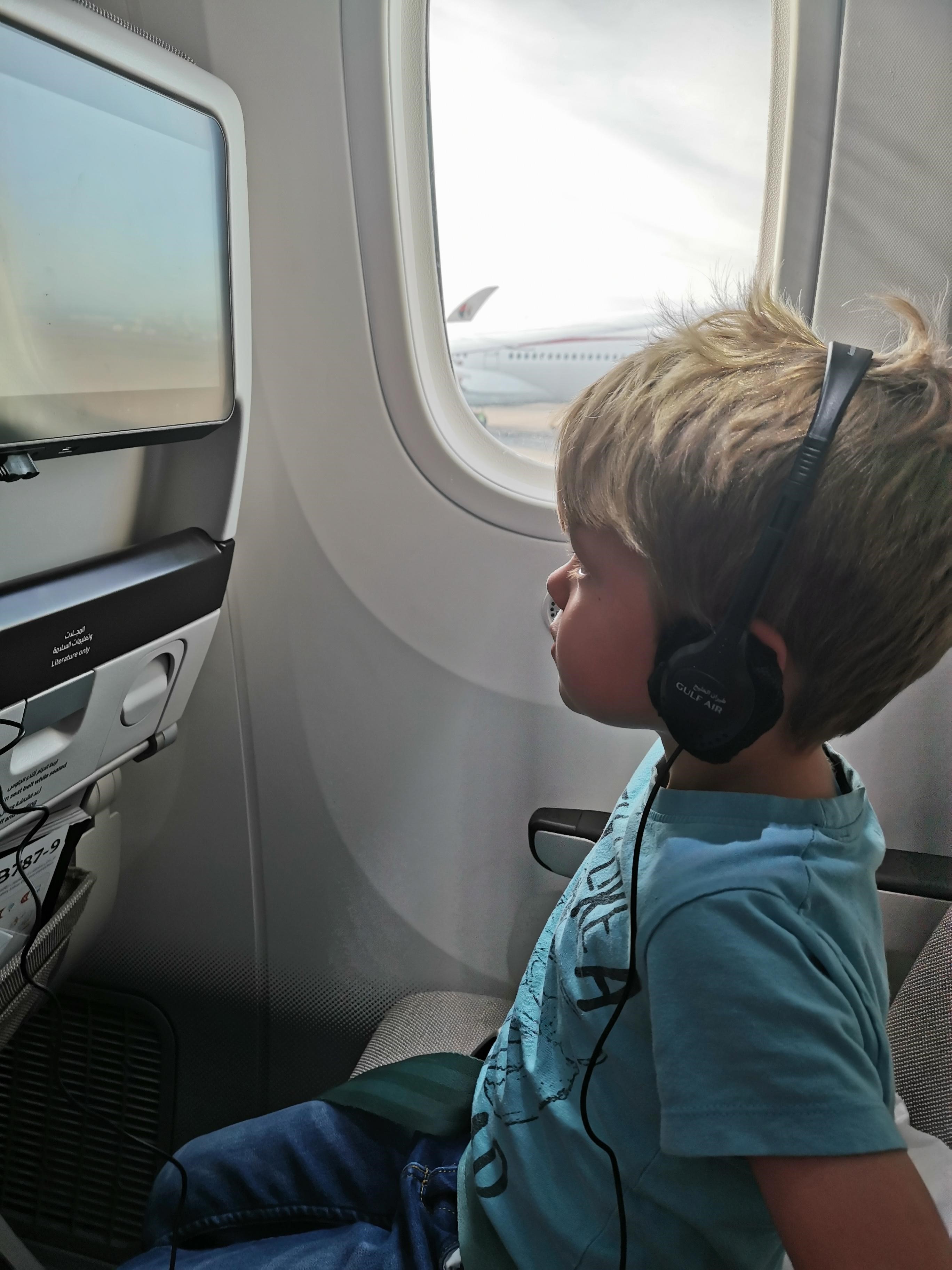 Our flight with Gulf Air was very comfortable. The boys enjoyed the entertainment and were given activity packs containing colouring pads, cards, play dough, and puzzles. I had prebooked children’s meals, which can be done online up to 24 hours before the flight. The main meal on the long flight from London to Bahrain was chicken goujons, mashed potato and carrots. There were vegetable sticks, cheese and crackers, a bread roll, chocolate pudding, and chocolate bar on the side. On the shorter flight from Bahrain to Dubai they were given cheese sandwiches and savory snacks.
