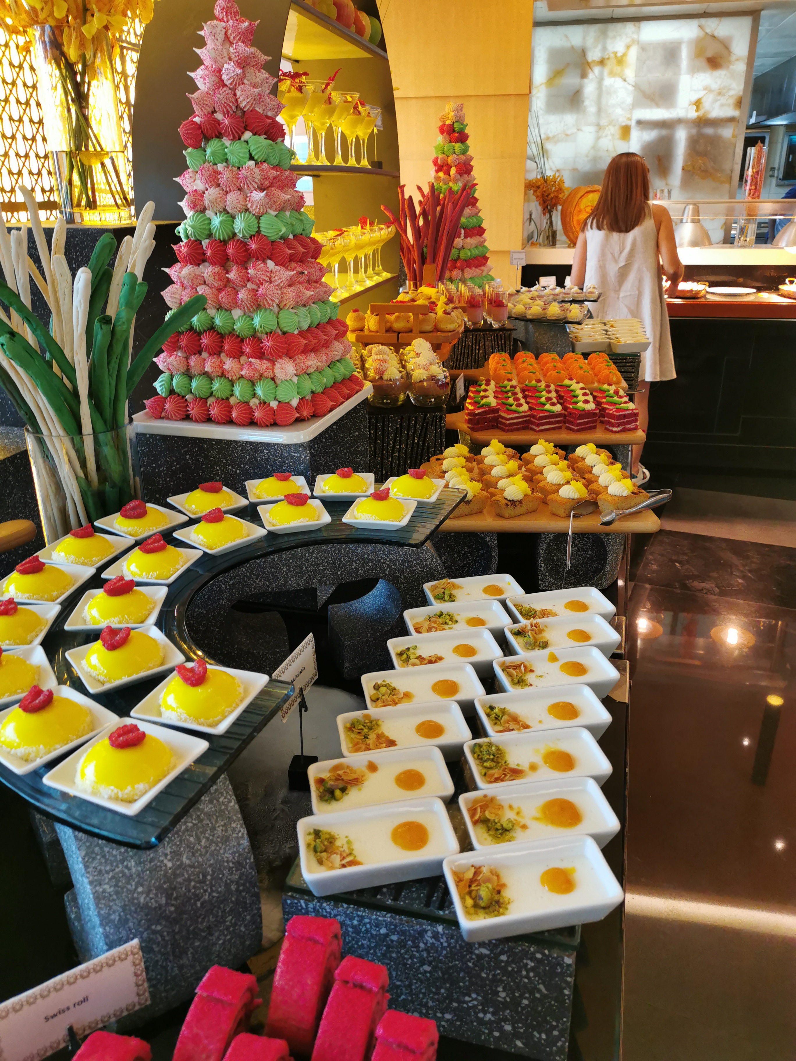 An array of international food is served from various cooking stations and is beautifully presented. Options included seafood, sushi, salads, pates, pasta, pizza, breads, a large selection of BBQ meats and fish, noodle and rice dishes, and roasts. The hardest thing is making sure you leave room for dessert!
