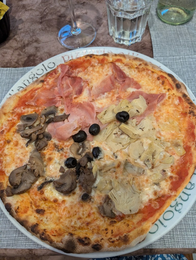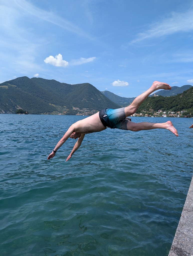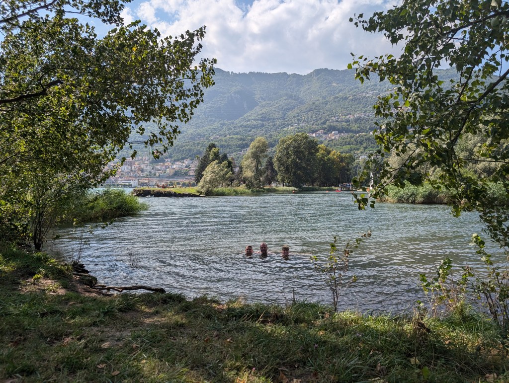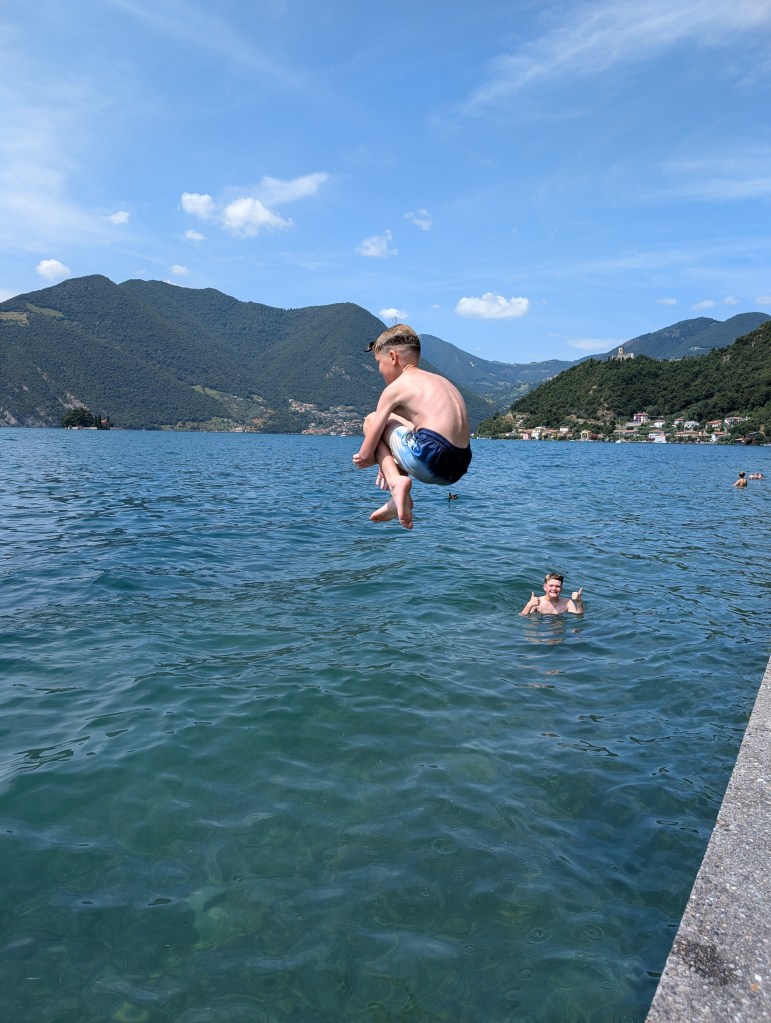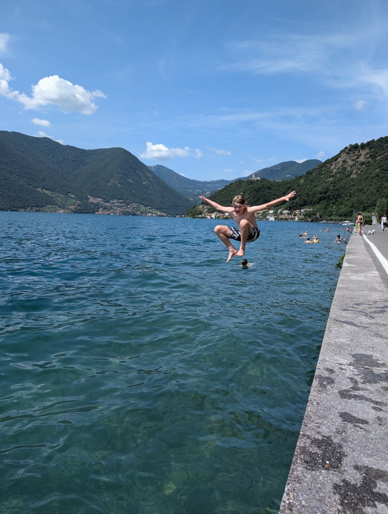 We stopped at Barracuda Café for ice cream and coffee. Then swam at Parco giochi. There is no beach here but steps down the lake wall into the water. It was a popular swim area with lovely clear water and deep enough to jump in from the wall (always a plus point for swim spot in our family!)