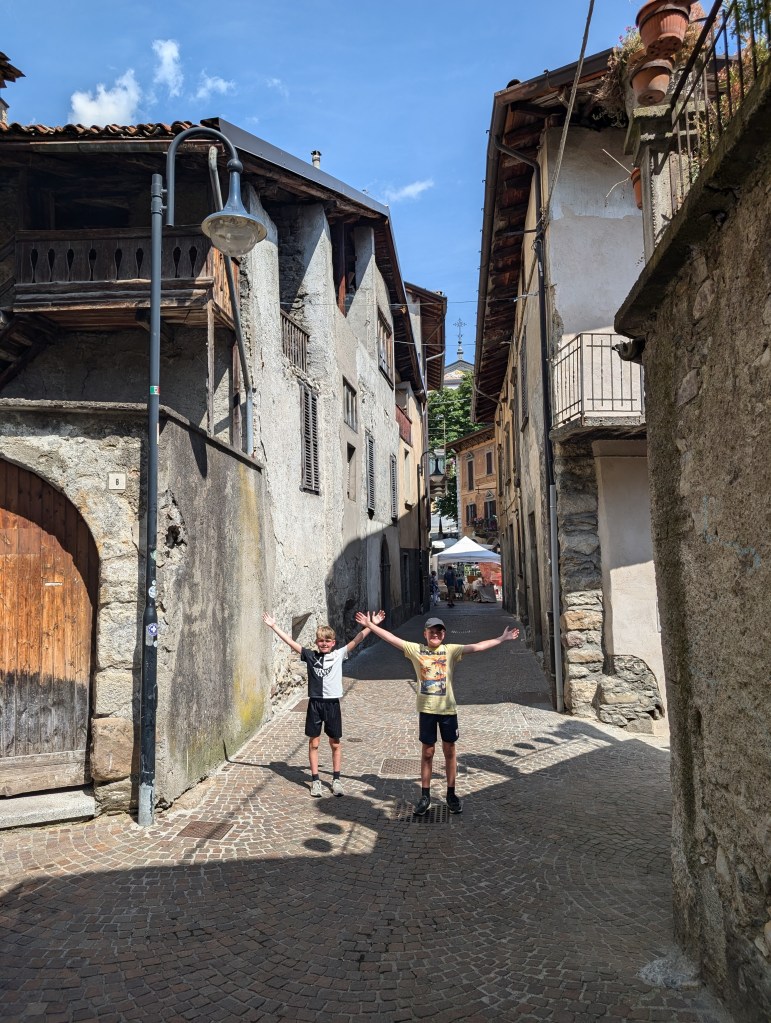 Once we had seen the view of the lake we turned back and walked from the chairlift down to the top of the first chair that we caught up. The plan was to take the chair back down to the bottom of the resort. However, the chairlift had a maintenance issue and was closed. The staff were amazing and offered us water while we waited for a jeep to come and pick us up to take us back down the mountain. We would have walked back down but they insisted on taking us. At the bottom there is an Adventure Park with high wires and zip lines, tubing, and mountain bike rental. Had we had more time here we would have done it all. On the way back to Lovere we stopped in Borno village which was gorgeous with narrow streets, a small main square, fountains, and a local market.