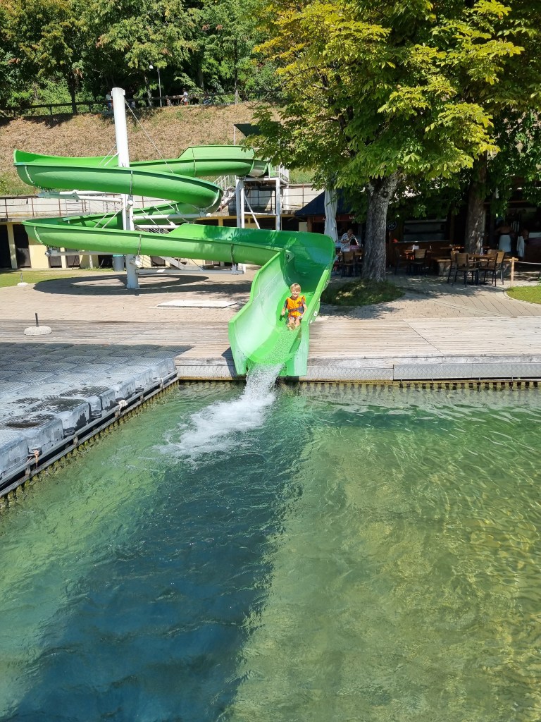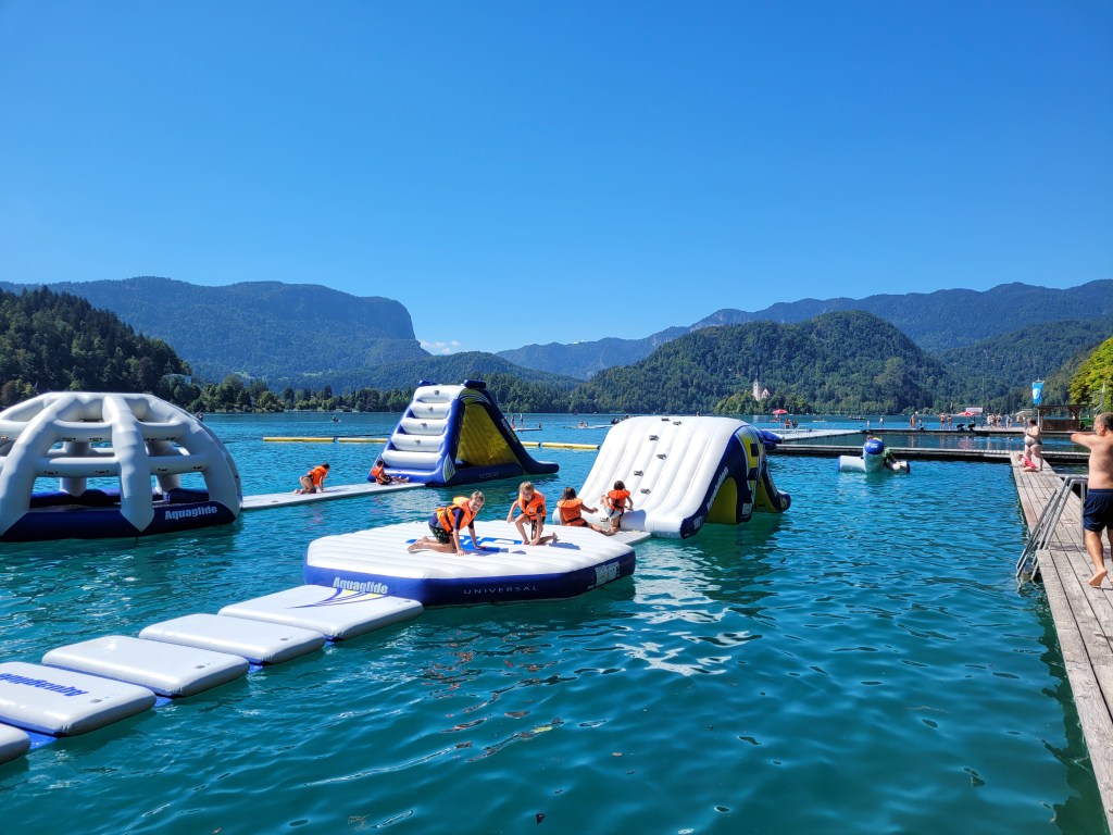 Afternoon: Spend the afternoon at Grajsko Kopališče (Lido Bled) on the northeast side of the lake, and just below the castle. The lido offers fenced pools with depths of 50, 120, and 180 cm, two waterslides, and a high diving board. There is an aqua adventure park, a children’s play area with a sandpit, and kayak rentals. Massage services, table tennis, and board games are available. Deckchairs and sunshades can be rented, and there is various food and drink options. The facility also includes changing rooms, lockers, toilets, and outdoor showers. The swimming area is accessible for the elderly and people with disabilities.